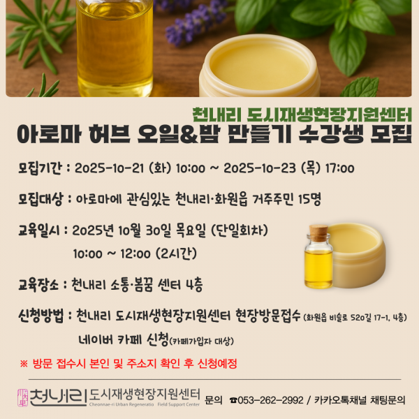 목록 25년 아로마 허브 오일&밤 만들기 수강생 모집(~10/23 17:00) 접수기간 2025-10-21 ~ 2025-10-23 모집대상 아로마에 관심있는 천내리·화원읍 거주주민 모집인원 15명 ※선착순 모집 아님 교육기간 2025년 10월 30일 목요일 (단일회차) 10:00~12:00 교육장소 천내리 소통·봄꿈센터 4층 참가신청 신청이 마감되었습니다. 프로그램 상세소개 자세한사항은 포스터를 참고해주세요