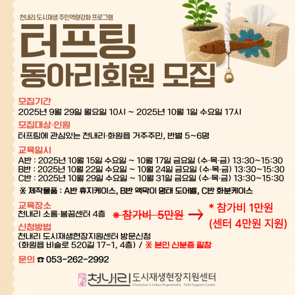 천내리 도시재생 터프팅 동아리 회원 모집(현장방문접수)(~10/1)