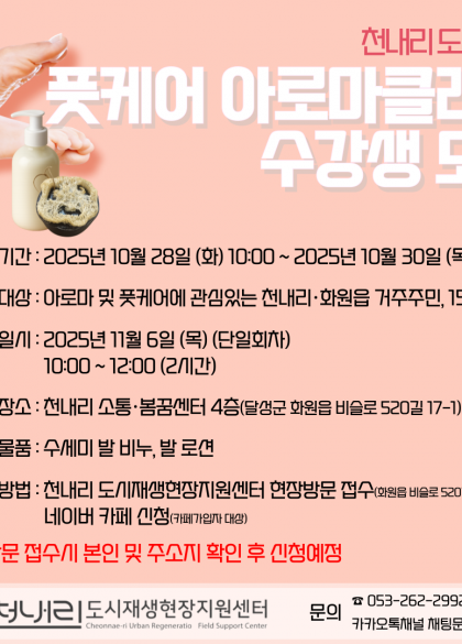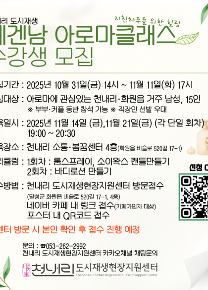 #프로그램 천내리만의 다양한 프로그램에 참여해보세요! CHEONNAE-RI 25년 천내리 도시재생 에겐남 아로마클래스 수강생 모집(~11/11) 천내리 도시재생 풋케어 아로마클래스 수강생 모집(~10/30 17:00) 25년 아로마 허브 오일&밤 만들기 수강생 모집(~10/23 17:00) 2025년 천내리 아로마젤파스 제작과정 수강생 모집(~10/17) 천내리 도시재생 터프팅 동아리 회원 모집(현장방문접수)(~10/1) 천내리 도시재생 10월 천내 요리교실(~9/16)(현장방문접수) 천내리 도시재생 제로웨이스트 교육과정(현장방문접수)(~9/11 12:00) 천내리 도시재생 터프팅 동아리회원 모집(현장접수) 미싱 마을강사활용 기초과정 터프팅 기초과정(현장방문신청)(연장모집 ~8/1 12:00) 제로웨이스트 & 여름시즌 클래스(현장방문신청)(연장모집 ~8/1 12:00) 25년 천내리 도시재생 생활 속 과학 교실 연장 모집(현장방문접수) 25년 케이크만들기 클래스 추가모집(수업취소) 25년 레진아트 교육과정 2025년 천내리 도시재생 터프팅 기초과정(~6/11)(현장방문신청)