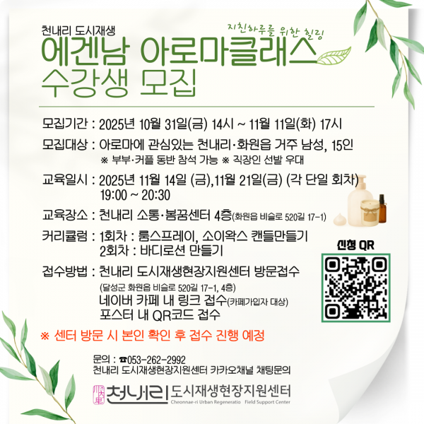 25년 천내리 도시재생 에겐남 아로마클래스 수강생 모집(~11/11)