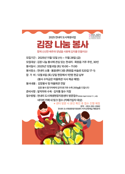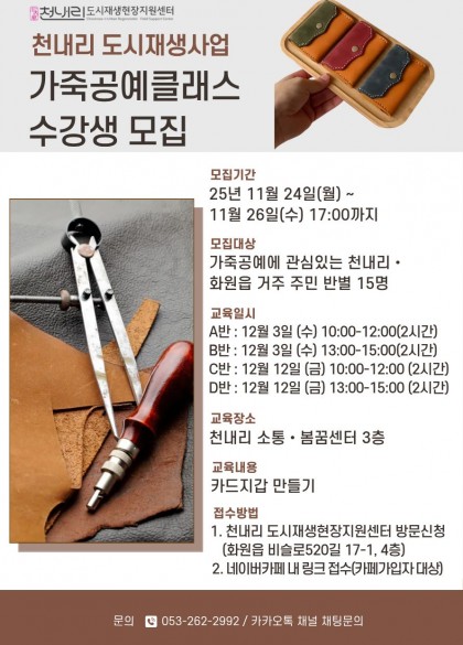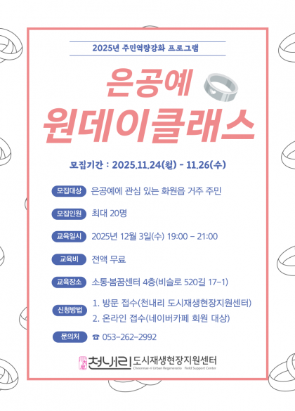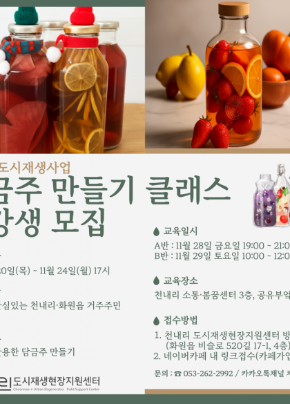 #프로그램 천내리만의 다양한 프로그램에 참여해보세요! CHEONNAE-RI 2025년 가죽공예클래스 수강생 모집 2025년 은공예 원데이클래스 수강생 모집 2025년 담금주 만들기 클래스 수강생 모집(~11/24) 2025년 김장나눔봉사 참여자 모집 25년 천내리 도시재생 에겐남 아로마클래스 수강생 모집(~11/11) 천내리 도시재생 풋케어 아로마클래스 수강생 모집(~10/30 17:00) 25년 아로마 허브 오일&밤 만들기 수강생 모집(~10/23 17:00) 2025년 천내리 아로마젤파스 제작과정 수강생 모집(~10/17) 천내리 도시재생 터프팅 동아리 회원 모집(현장방문접수)(~10/1) 천내리 도시재생 10월 천내 요리교실(~9/16)(현장방문접수) 천내리 도시재생 제로웨이스트 교육과정(현장방문접수)(~9/11 12:00) 천내리 도시재생 터프팅 동아리회원 모집(현장접수) 미싱 마을강사활용 기초과정 터프팅 기초과정(현장방문신청)(연장모집 ~8/1 12:00) 제로웨이스트 & 여름시즌 클래스(현장방문신청)(연장모집 ~8/1 12:00)